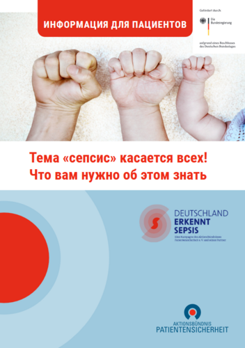Die Broschüre klärt auf Russisch über Sepsis auf: Risikogruppen, Entstehung einer Sepsis, Symptom und Behandlung. Außerdem werden Langzeitfolgen und Maßnahmen zur Vorbeugung dargestellt. Erstellt vom Aktionsbündnis Patientensicherheit e. V..