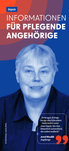Der Flyer zeigt allgemeine Informationen zur Sepsis und macht auf die acht Schulungsvideos für pflegende Angehörige aufmerksam, die auf dem YouTube-Kanal von #DeutschlandErkenntSepsis zu finden sind.
