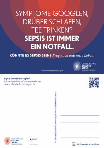 Postkarte mit Stickeroption von #DeutschlandErkenntSepsis mit dem Motiv: „Sepsis ist immer ein Notfall“.