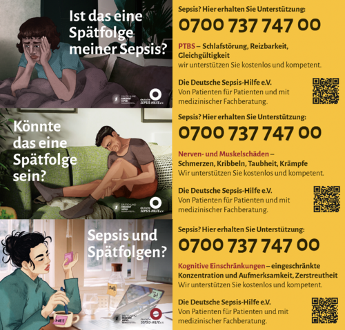 Drei Visitenkarten, die auf die Telefonnummer und Webseite der Deutschen Sepsis-Hilfe e.V. verweisen.